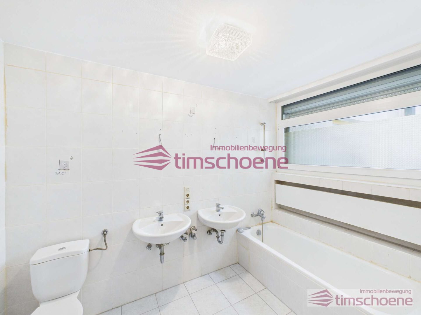 - ein Badezimmer mit einer Badewanne, das mit zwei Waschbecken und einem WC versehen ist