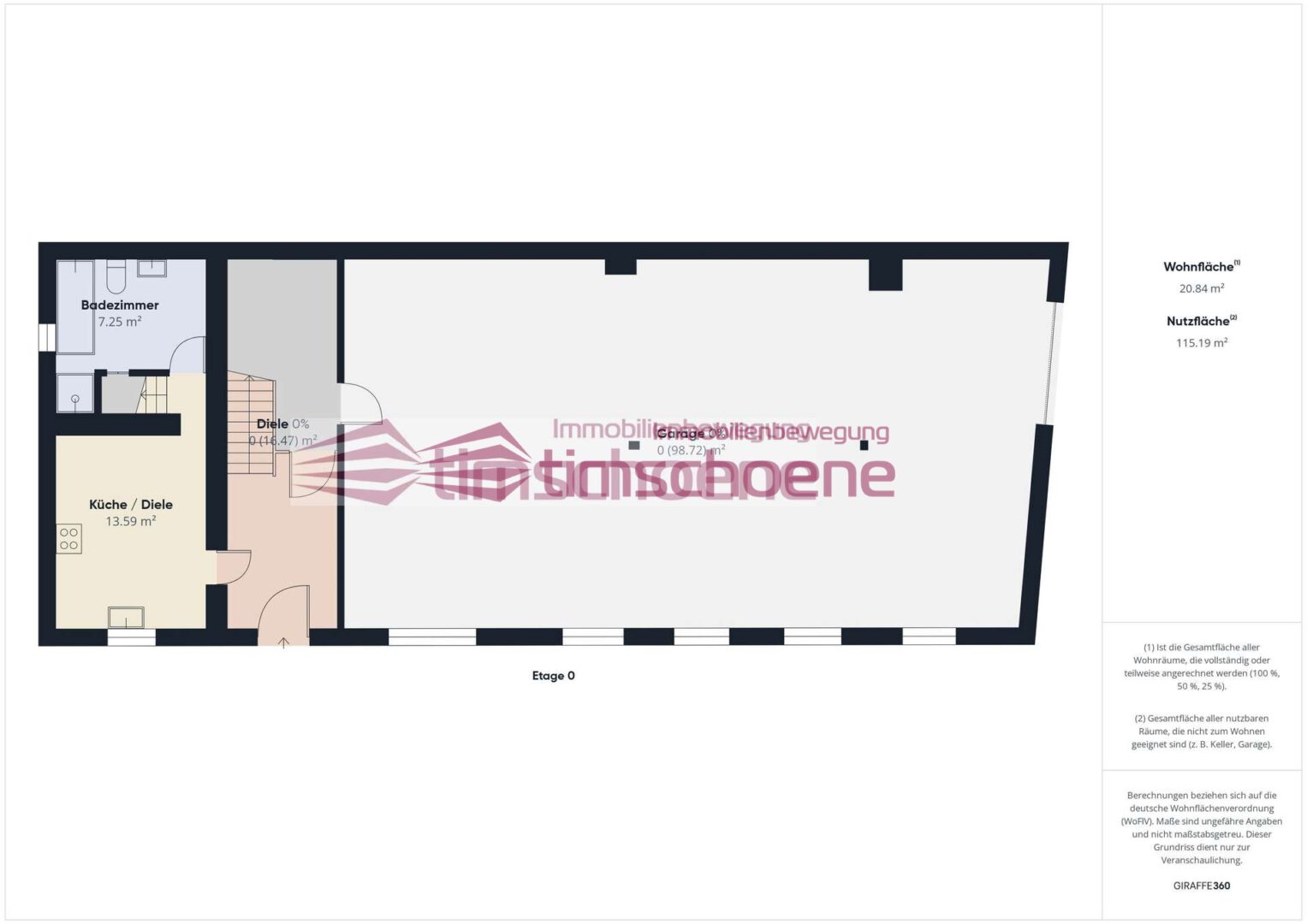Das Haus erstreckt sich über zwei Etagen. Die untere Ebene dient aktuell größtenteils als Garage bzw. Halle (ca. 100 m²!) und bietet vielfältige Optionen zur Nutzung. Im hinteren Teil dieser Etage befinden sich eine funktionale Küche sowie ein Badezimmer.