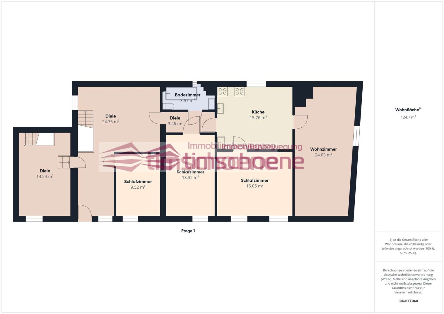 Über ein zentrales Treppenhaus gelangt man in das Obergeschoss, welches den Hauptwohnbereich bildet. Hier stehen eine Küche, ein Wohnzimmer, drei Schlafzimmer sowie ein weiteres Badezimmer zur Verfügung. Vom Flur aus besteht Zugang zu einem kleinen Balkon, der einen weiten Blick ins Grüne bietet.