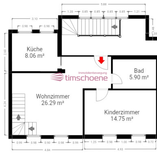 Im ersten Obergeschoss befinden Sie sich im großzügigen Wohnzimmer, das durch seine helle und einladende Atmosphäre besticht. Angrenzend liegt die praktische Küche, die auf Wunsch mit der Einbauküche des Vormieters erworben werden kann. Ein geräumiges Kinderzimmer und ein Bad mit Wanne vervollständigen diese Etage.