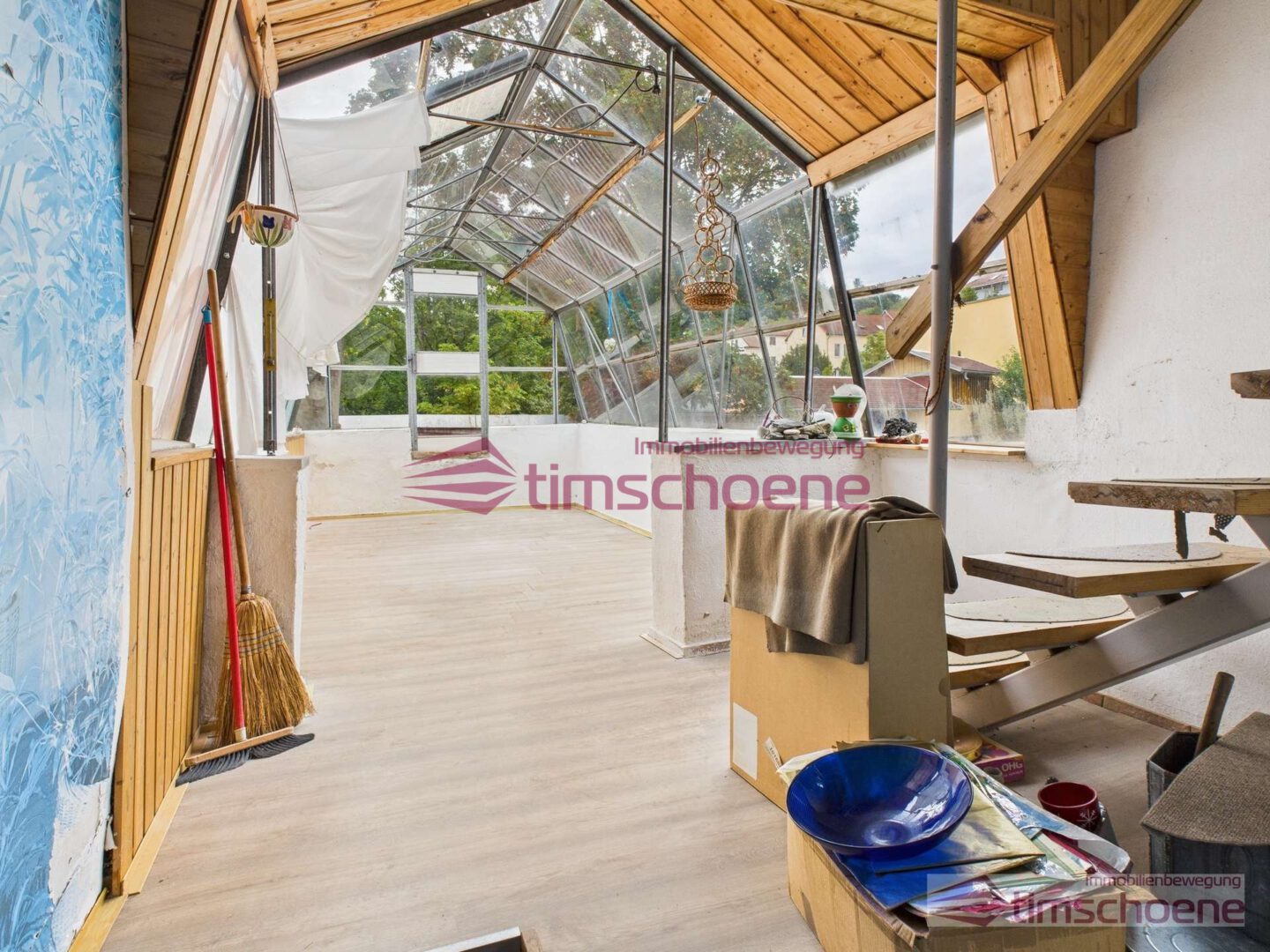 Das erste Obergeschoss bietet eine weitere Diele, eine Küche, ein großes sonniges Wohnzimmer, ein WC und zwei weitere Zimmer. Der angrenzende Wintergarten ermöglicht einen direkten Blick zum direkten Baumbestand in der Umgebung.